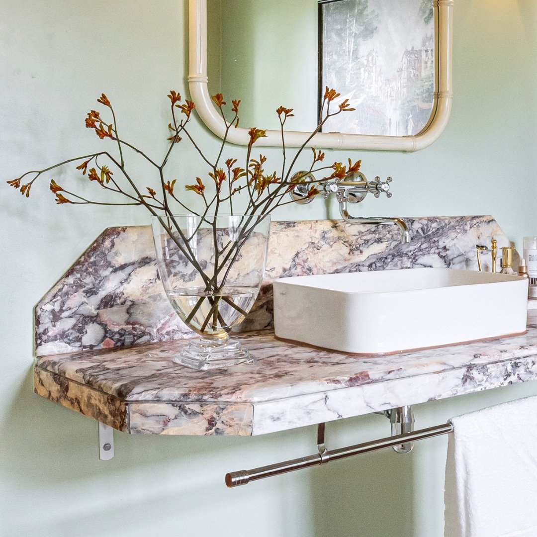 När det var dags att planera badrummet hade hon en stor yta att jobba med. Målet var att skapa något lekfullt men genomtänkt, med en udda planlösning som ger wow-effekt utan att kännas krånglig. Precis som i resten av hemmet återkommer den italienska känslan, med färg, värme och detaljer som sticker ut, men aldrig känns överarbetade.