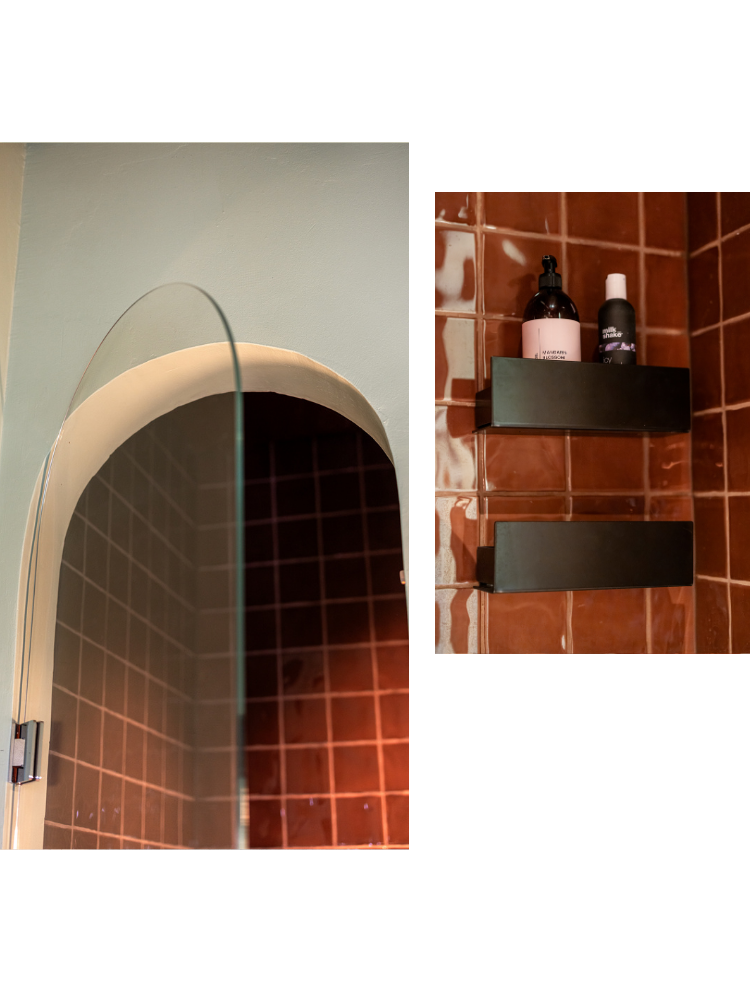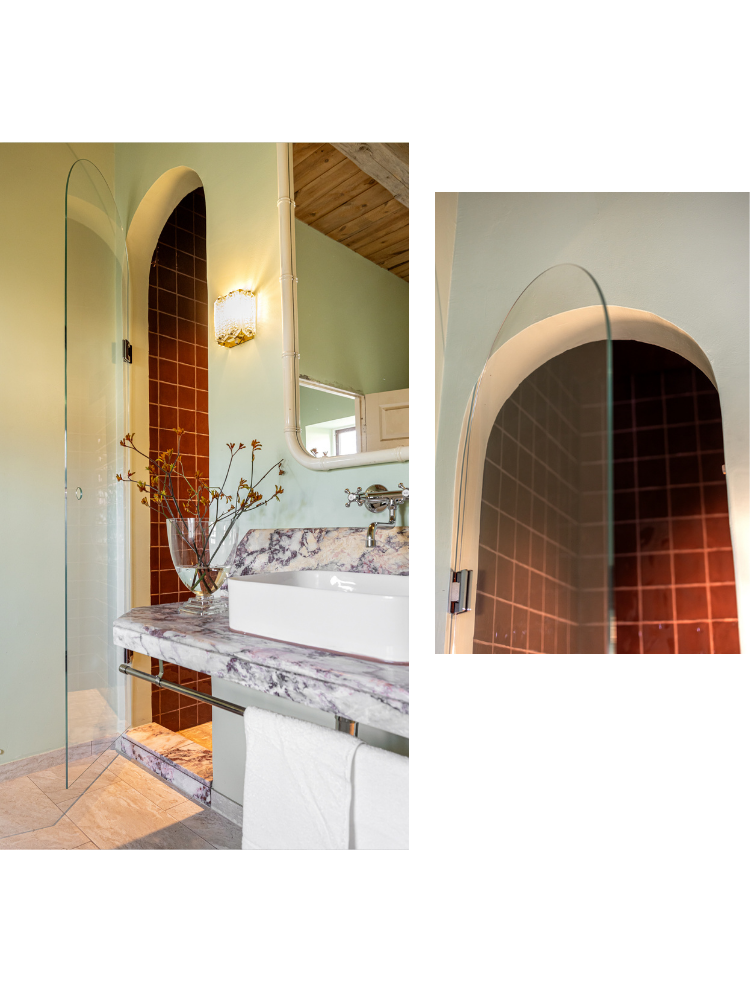I huset återkommer valvformade detaljer i dörröppningar och arkitektur, något som också fick prägla badrummet. För att låta rummet samspela med helheten valde Negin en måttanpassad duschlösning från oss, där hon tillsammans med en av våra duschkonstruktörer tog fram en specialanpassad duschdörr för det valvformade utrymmet. Duschdörren följer valvets form med precision, vilket skapar ett sömlöst och harmoniskt uttryck, berättar hon.