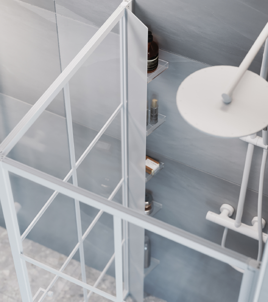 Tidy är en stilren hylla med plats för mycket förvaring. Hyllan har ett snyggt hölje i frostat glas eller svart glas som på ett effektivt sätt döljer alla duschprodukter i hyllorna. Duschutrymmet förblir snyggt och städat med en öppen, dold förvaring. Tidy är försedd med 6 st avtagbara hyllor med gott om plats för schampo, balsam och duschkräm. 185x130x1960/2000 mm (BxDxH)OBS! Empire ska vara monterad med bred väggprofil (svart 7403456, vit 7403474) för att Tidy duschhylla ska rymmas och inte störa dörrfunktionen. Läs mer
